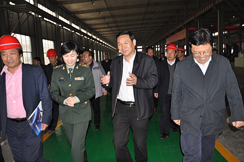 參觀期間,劉洋一行認真了解了企業的發展情況,每到一處設備前,郭現生董事長都會熱情地介紹設備名稱、作用等,劉洋不時點頭稱贊,參觀完重機車間,劉洋一行在車間門口與市領導及公司負責人合影留念。